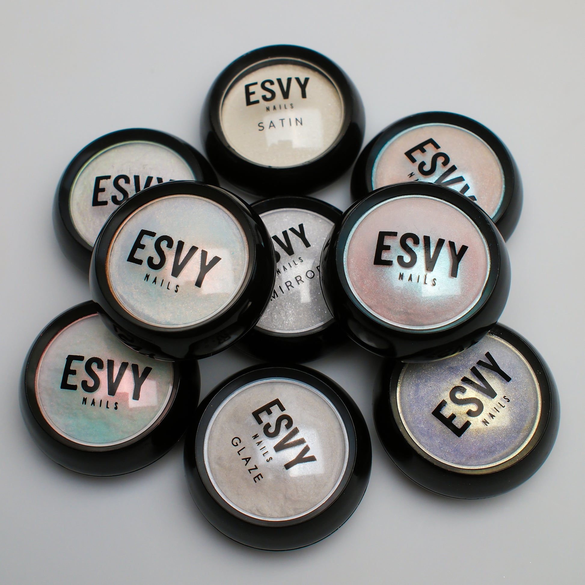 ✨ ESVY's Chrome Powder bundle includes all nine— Glaze, Satin, Mirror, Slow Burn, Sunset Alchemy, Zenon, Peach Glacier, Berry Glacier & Watermelon Sugar. Whether you prefer a subtle shimmer or a bold, eye-catching effect, our 9 different chrome powders allow you to achieve a professional, salon-quality finish right at home.