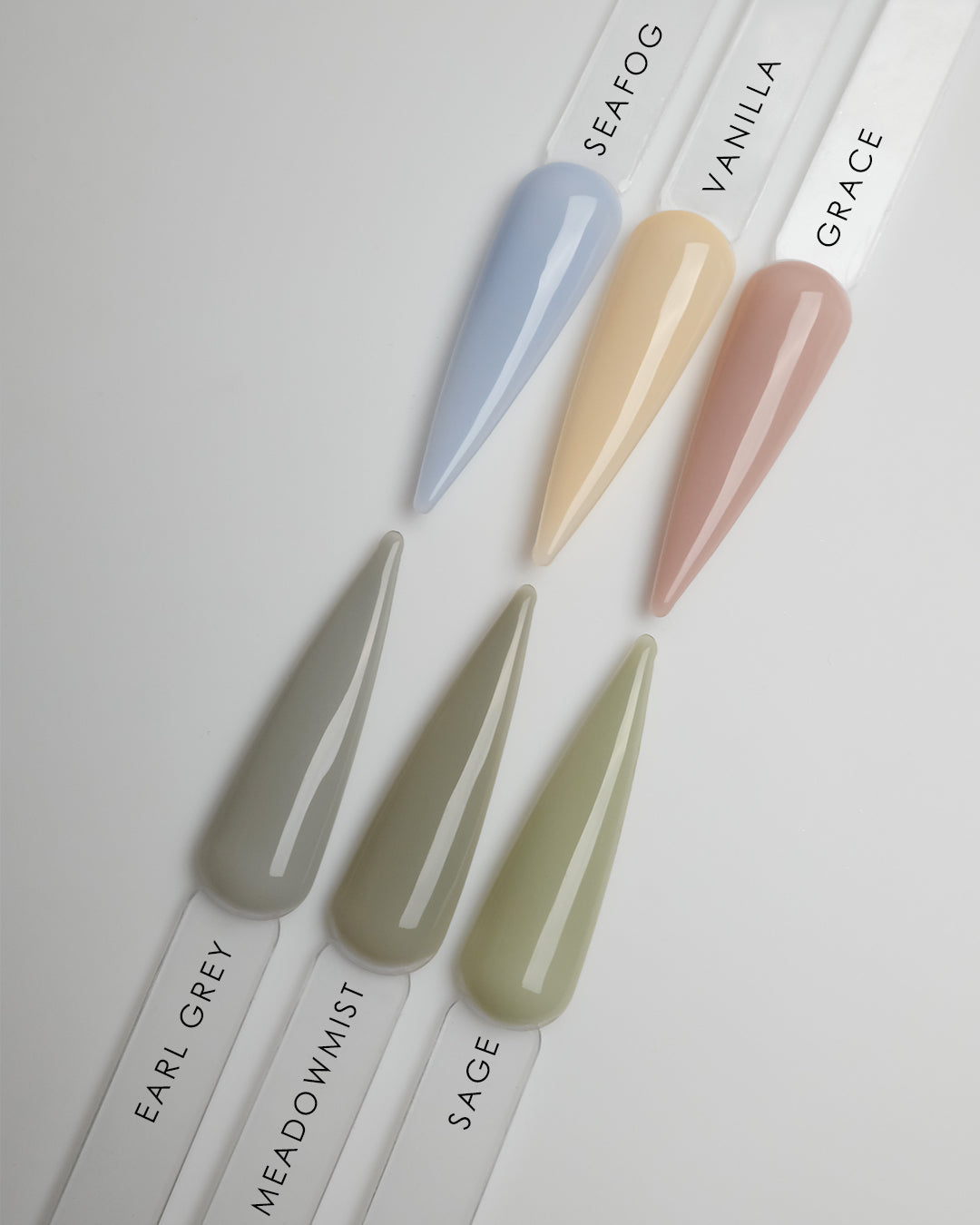 • 15ml x6 - Spring Rubber Base Bundle includes - Seafog, Vanilla, Grace, Sage, Meadowmist, Earl Grey